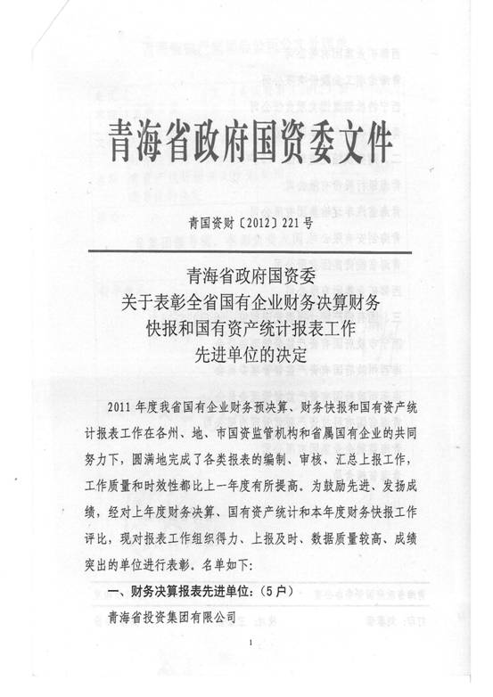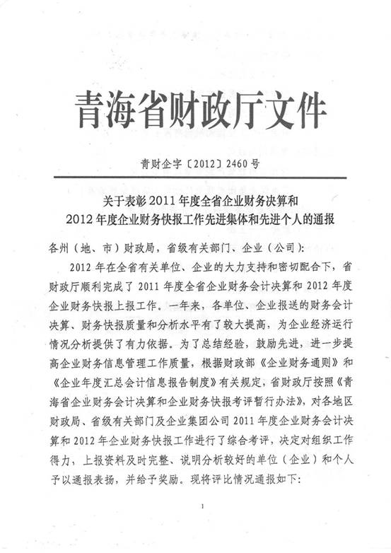 2012年,在集團(tuán)及所屬各公司領(lǐng)導(dǎo)的高度重視下,在所屬各公司的大力支持和密切配合下,在辛勤工作在財務(wù)會計崗位上的同事們的共同努力下,集團(tuán)總公司圓滿完成了省國資委和省財政廳各類報表的上報工作,財務(wù)信息工作質(zhì)量、時效性和財務(wù)分析水平都比上一年度有所提高,受到了省國資委和省財政廳的好評,集團(tuán)總公司2011年度財務(wù)決算工作被省國資委評為先進(jìn)單位,集團(tuán)財務(wù)審計部張莉青同志被省財政廳評為2012年度財務(wù)快報工作先進(jìn)個人。